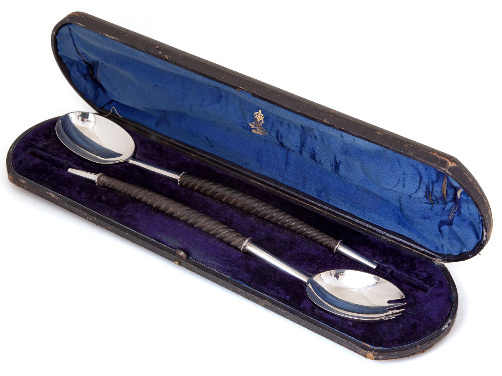 Antique Silver Plated Servers with Ebony Wood Carved Rope Design Handles