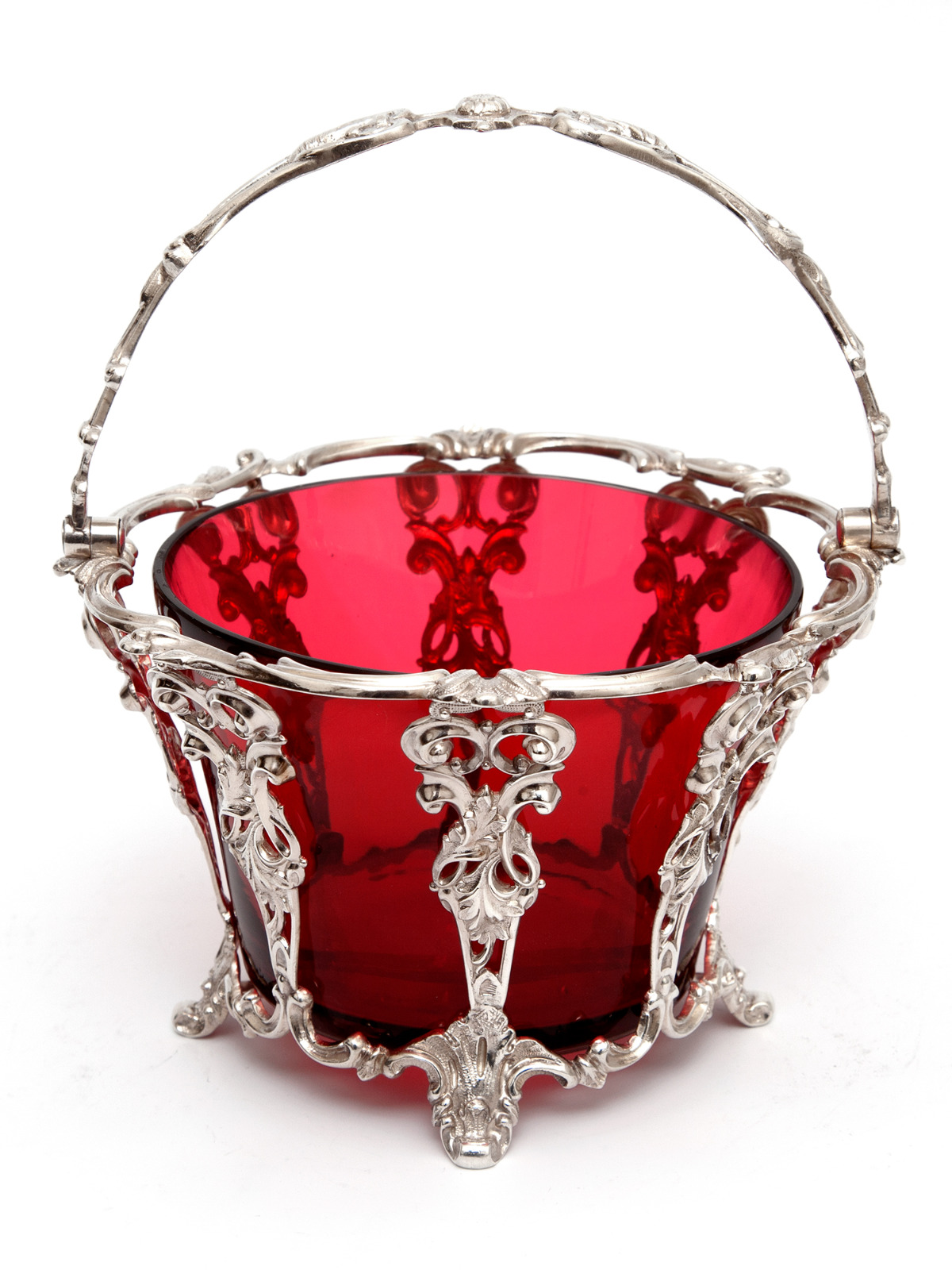 Antique Silver Plated Sugar Basket with a Red Cranberry Glass Liner