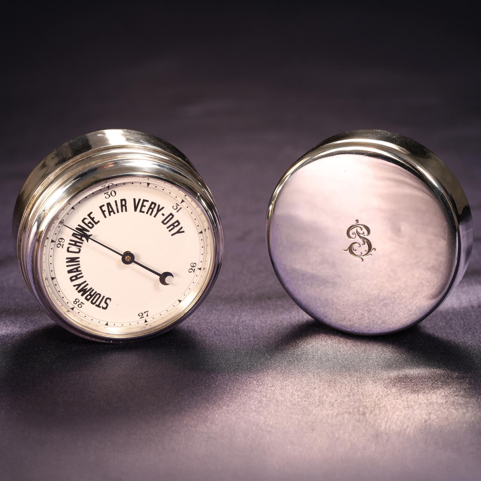 A good aneroid pocket or desk barometer in silver case by Grey & Co, Birmingham, c1909.