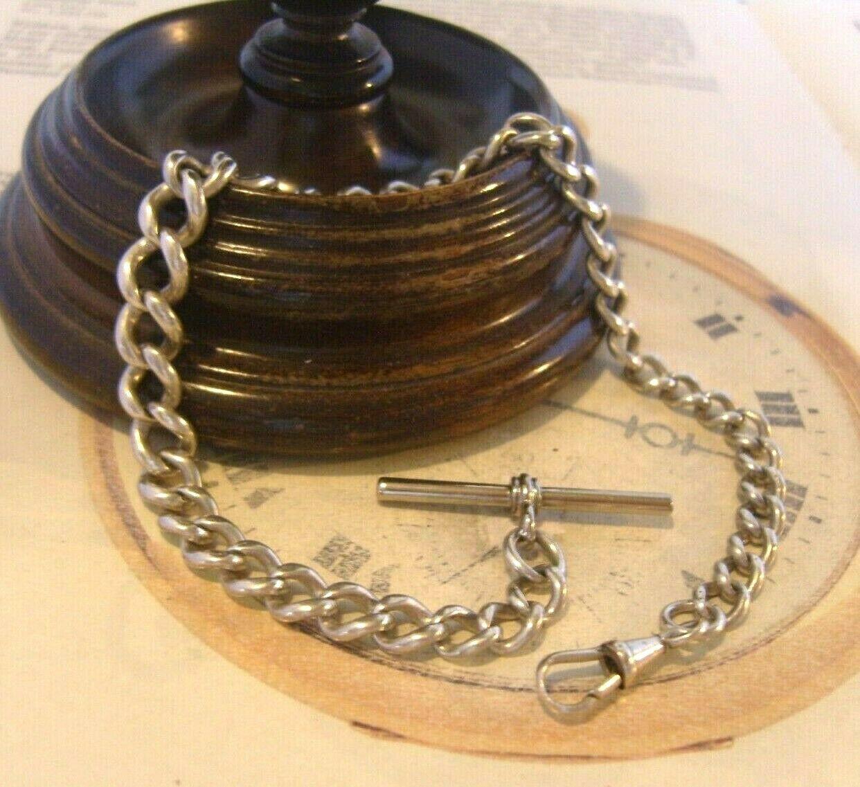 Antique Silver Pocket Watch Chain 1890s Victorian Graduated Curb Link Albert & T Bar