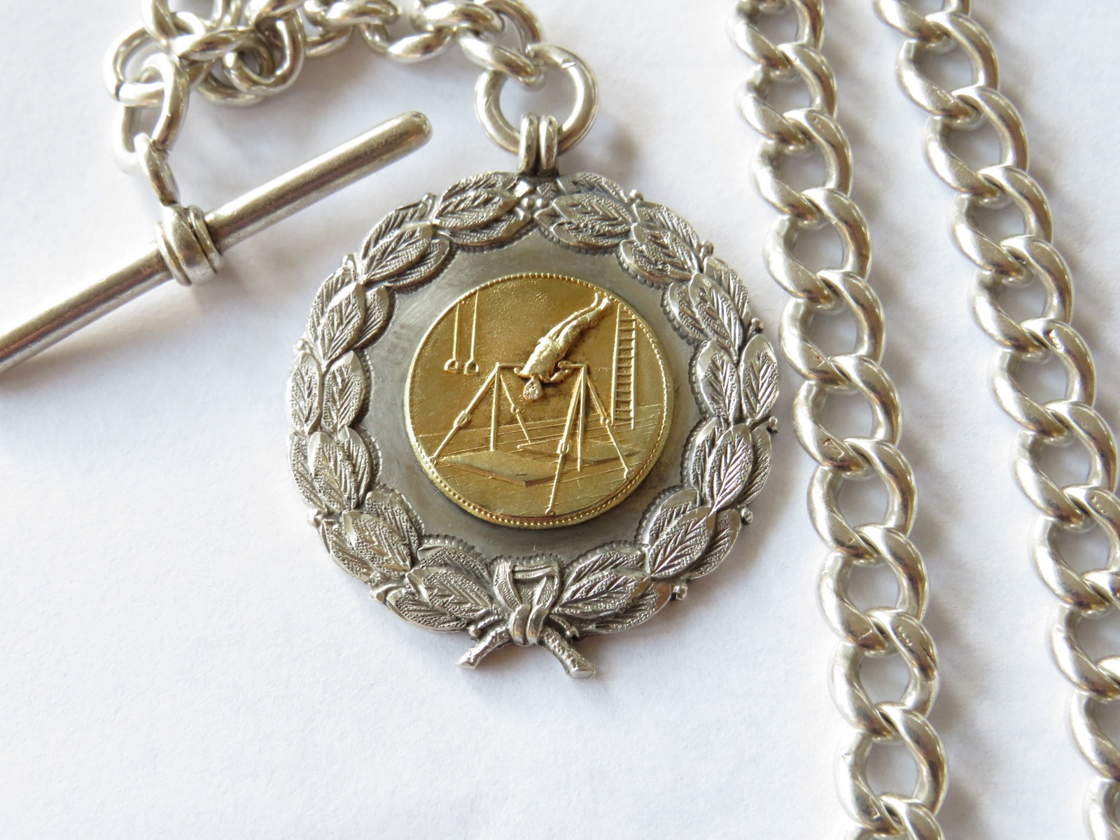 Antique Silver Pocket Watch Chain & Gymnastics Fob