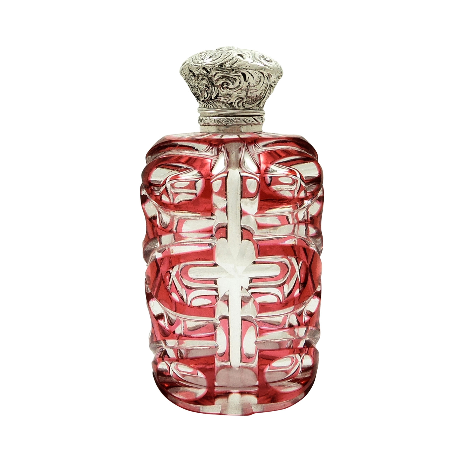 Antique Silver & Red Overlay Cut Glass Perfume / Scent Bottle c.1890