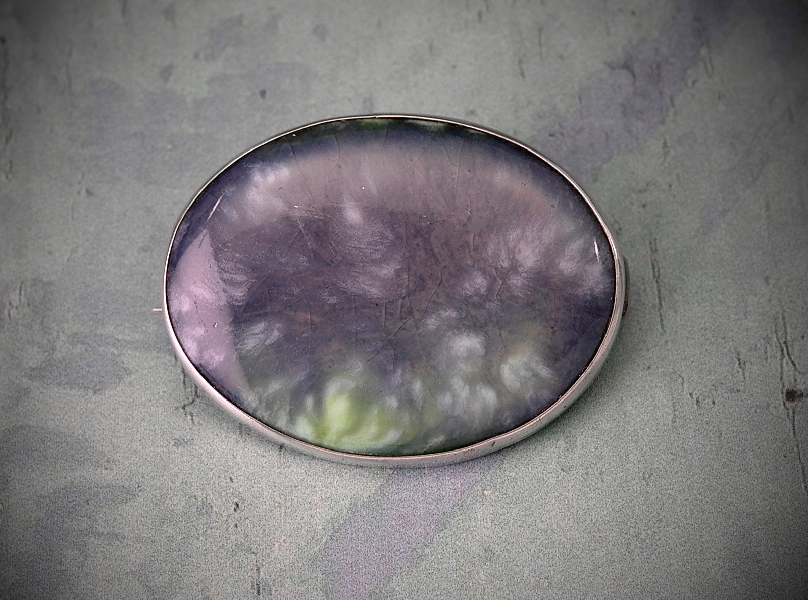 Antique Silver & Ruskin Style Enameled Ceramic Brooch c.1918