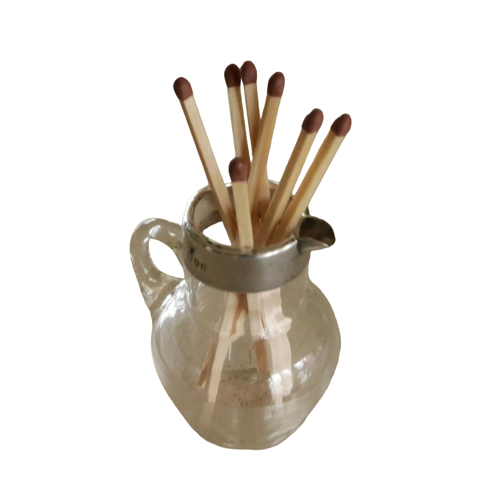 Here we present an unusual threaded glass 'match strike' in the form of a miniature jug or ewer. It bears the silversmith mark of Simon and Adler and was assayed in London in 1902.
