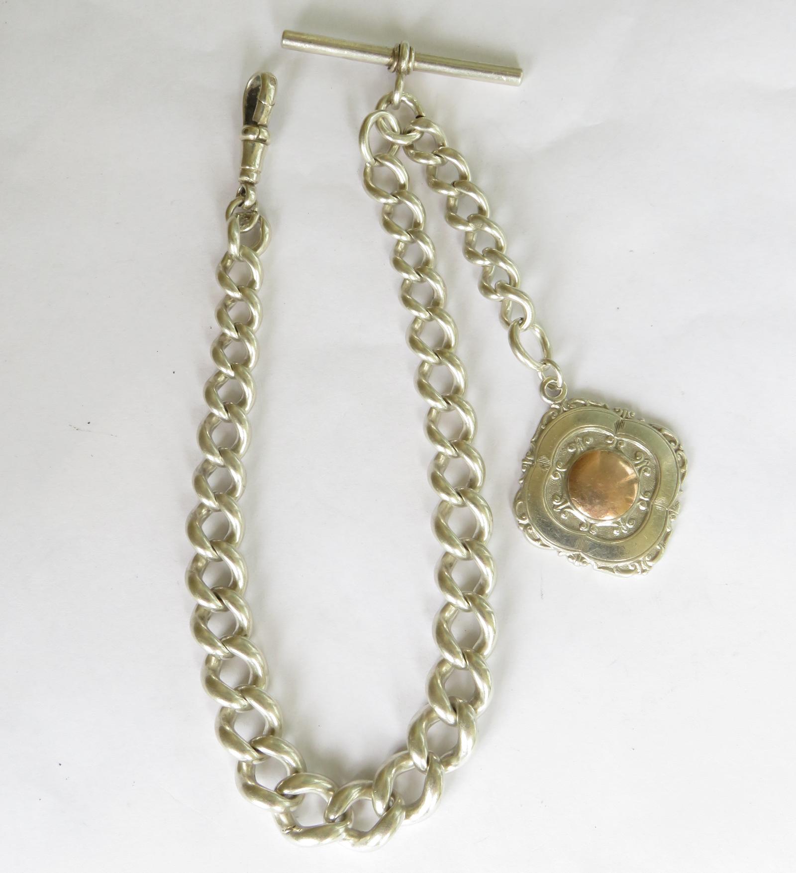 Antique Single Silver Watch Chain & Fob