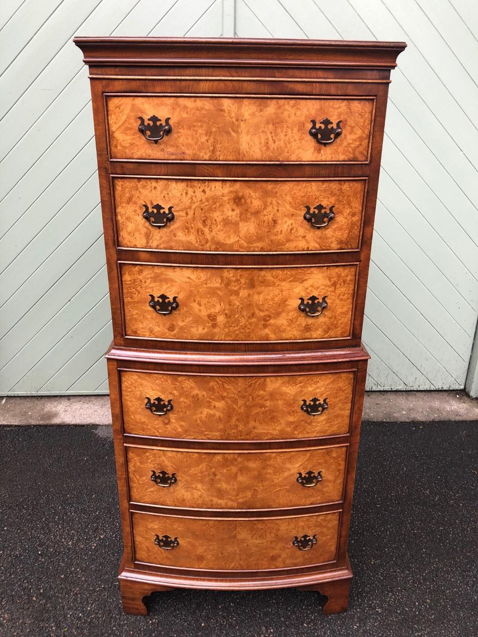 Antique Slim Burr Walnut Chest on Chest Tallboy