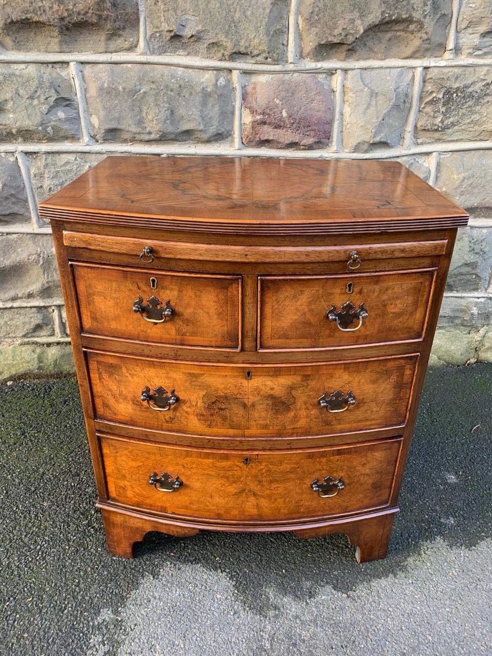 Antique Small Burr Walnut Bow Front Chest of Drawers