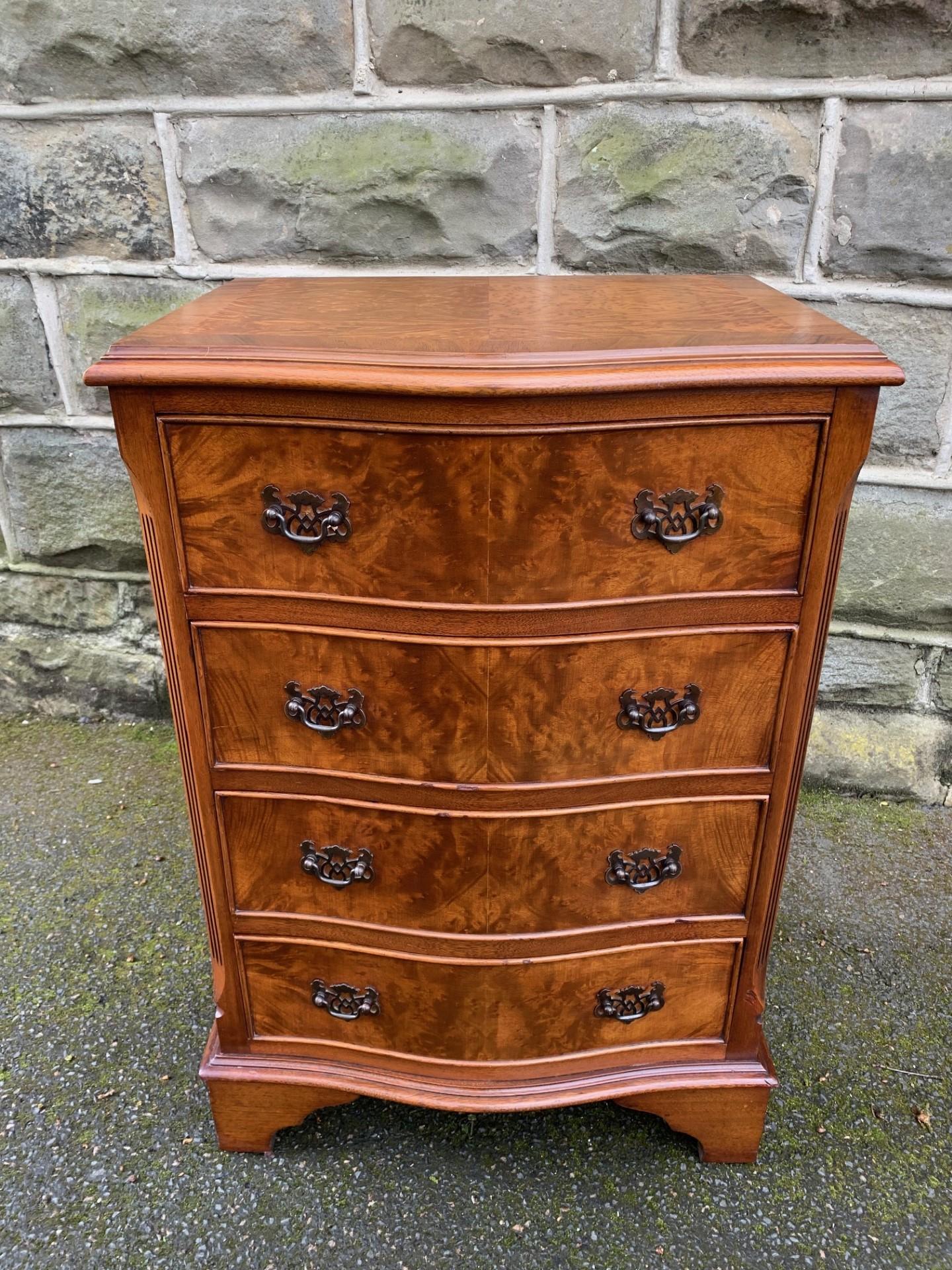 Antique Small Serpentine Burr Walnut Bedside Chest Drawers