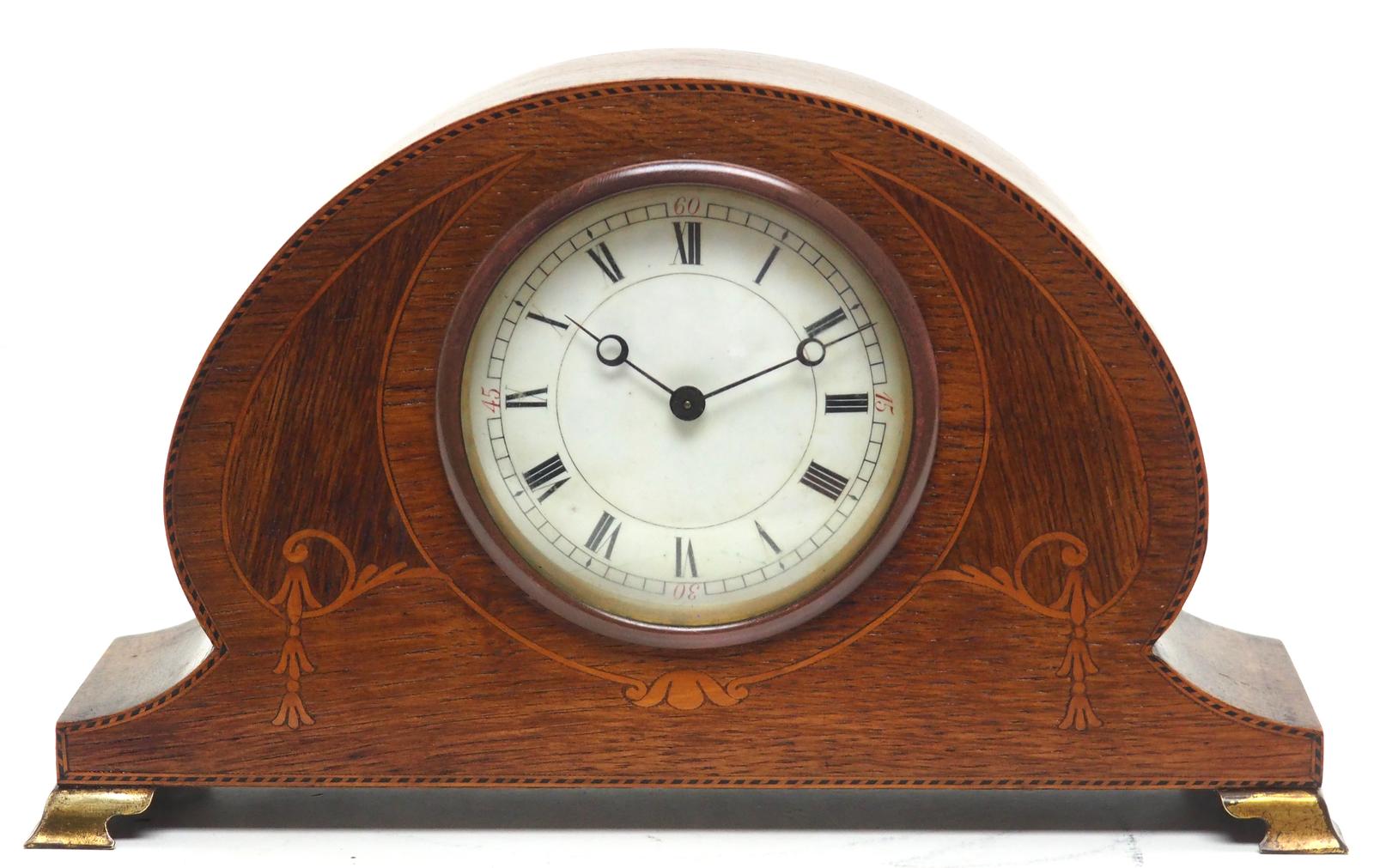 Antique Solid Mahogany Edwardian Timepiece Clock Hat Shaped with Satinwood Inlaid Decoration (1 of 9)