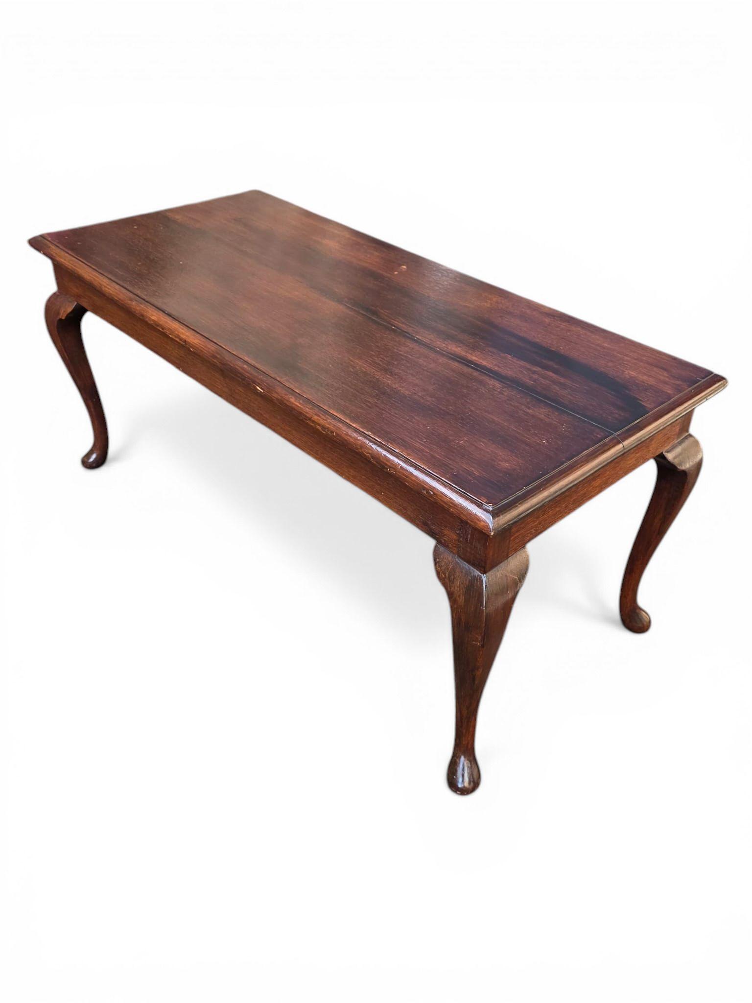 A beautiful antique solid oak coffee table, showcasing elegant proportions and classic period design. The piece features a rectangular top with gently moulded edges, raised on graceful cabriole legs that add a refined, traditional character.