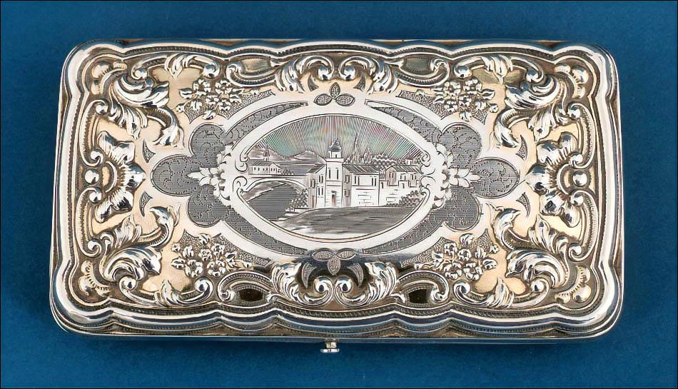 The box features very rich and carefully executed decoration, carried out with great precision. On one side there is an engraved scene depicting a village landscape, where a river crossed by a bridge can be clearly seen, with buildings in the background. The engraving is fine and detailed, with a good sense of depth and a balanced composition. The opposite side is centered on a shield with the engraved initials “JJ”, surrounded by abundant vegetal ornamentation composed of acanthus leaves, foliage and floral motifs that cover almost the entire surface.