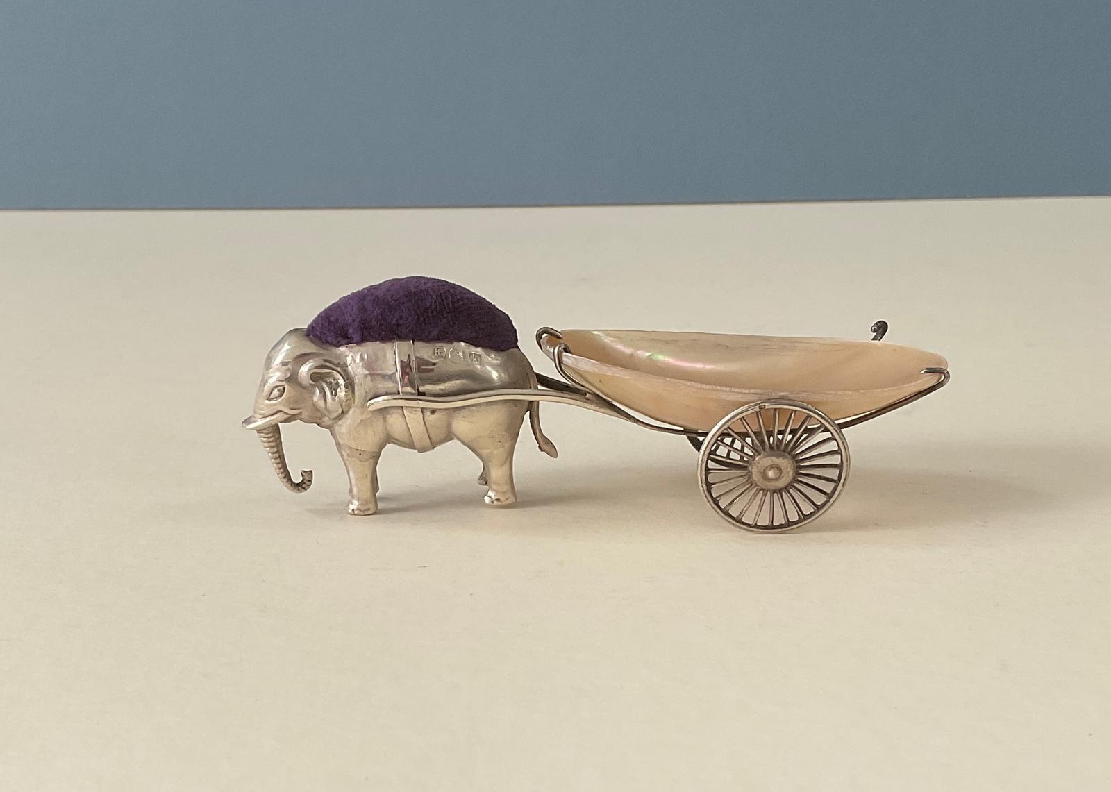 This is a lovely example of Edwardian craftsmanship - a solid sterling silver elephant pin cushion, pulling a very useful mother-of-pearl cart!