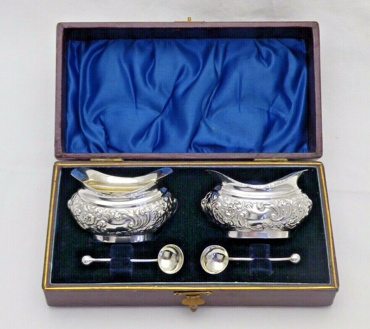 Antique Solid Silver Pair Cased Mustard Salt Pots with Spoons 1899