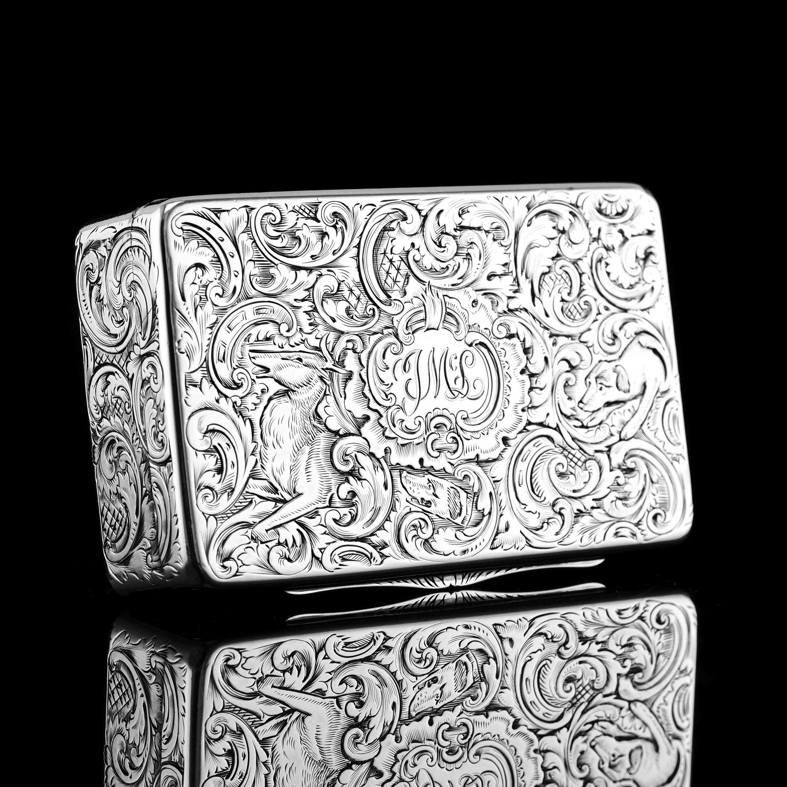 Antique Solid Silver Snuff Box with Marvellous Hunting Forest Scene Engraving - Charles Rawlings & William Summers 1837
