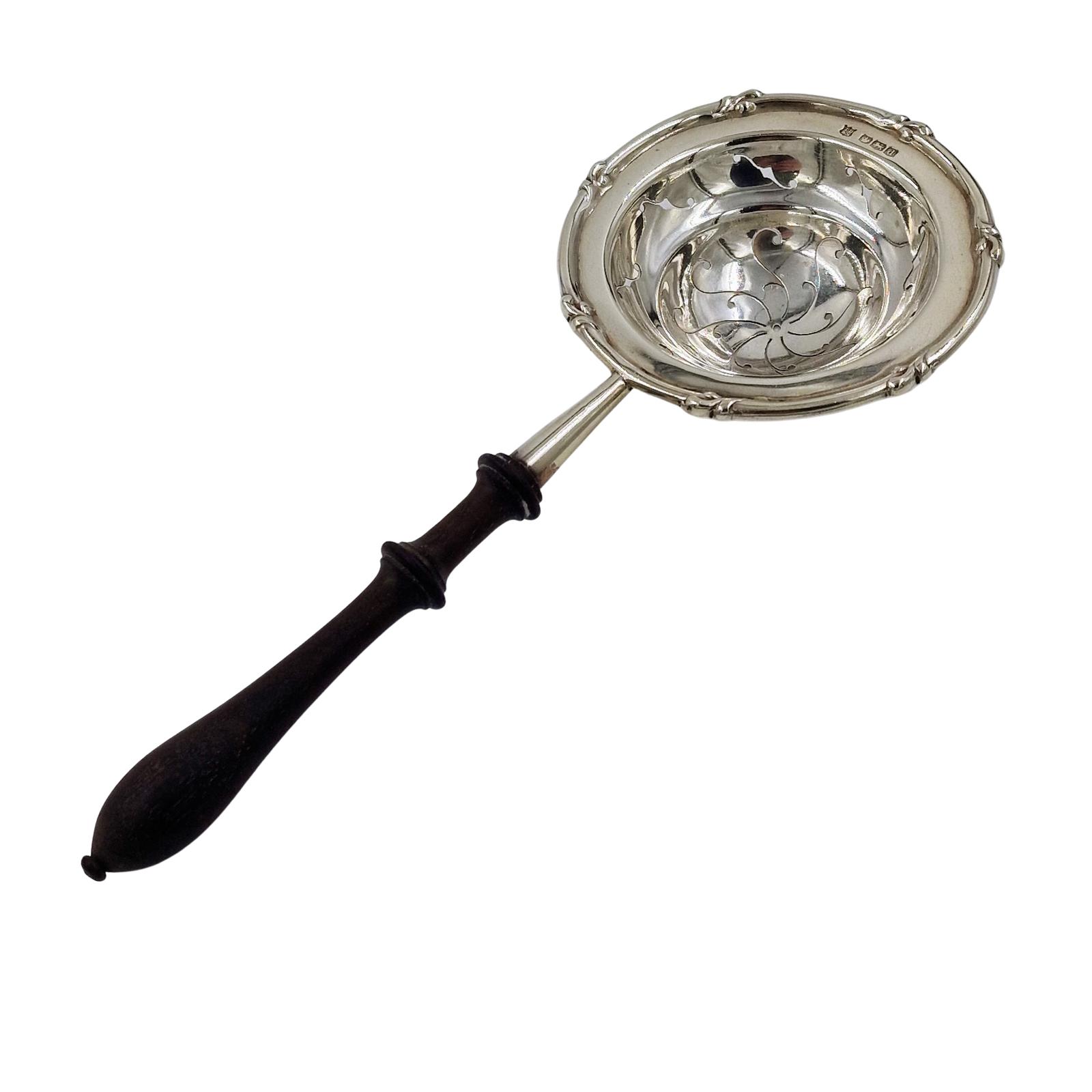 Antique Solid Silver Tea Strainer Treen Handle 1921 Thomas Bradbury & Sons