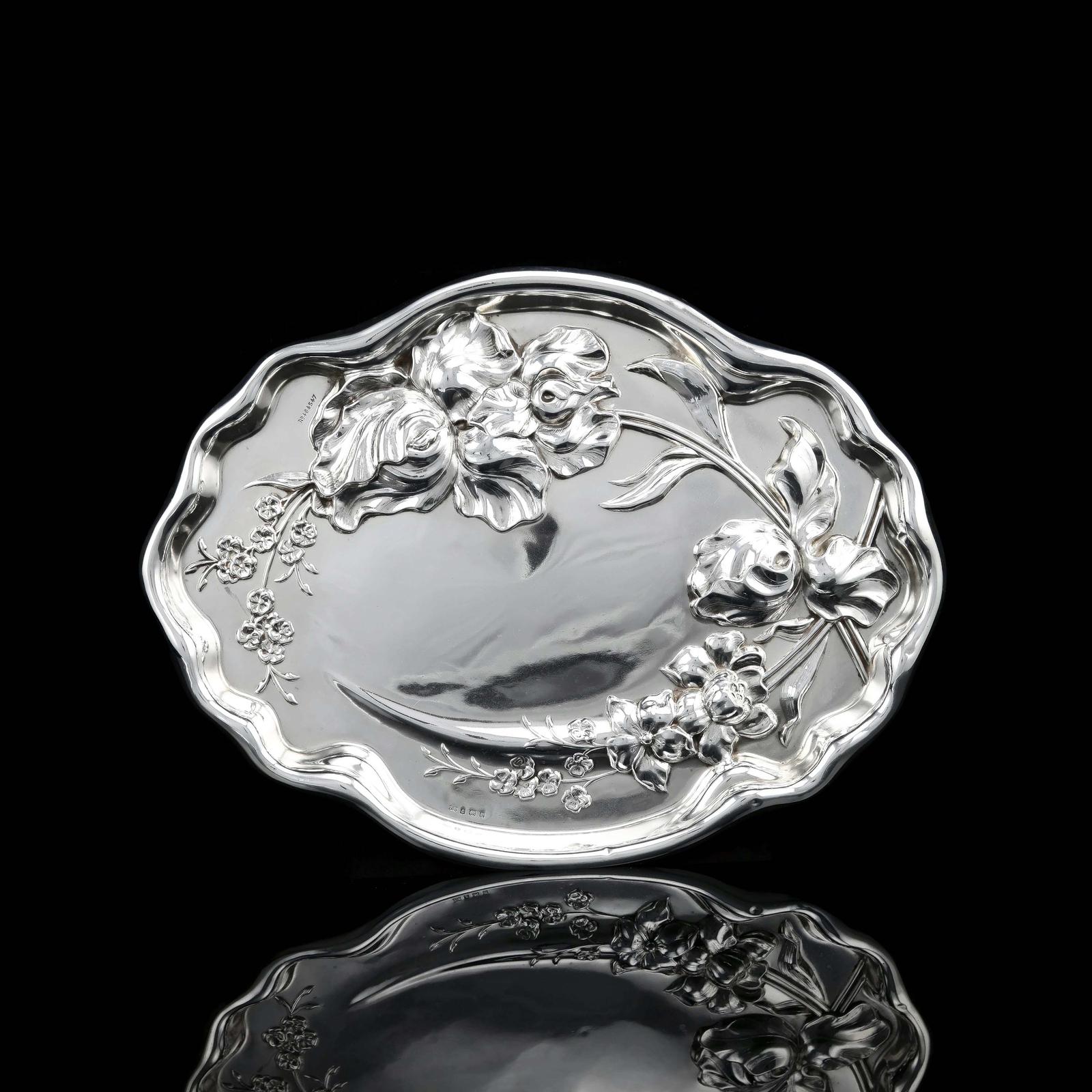 Antique Solid Sterling Silver Large Dish / Tray with Art Nouveau Floral Design - Thomas Bishton 1907
