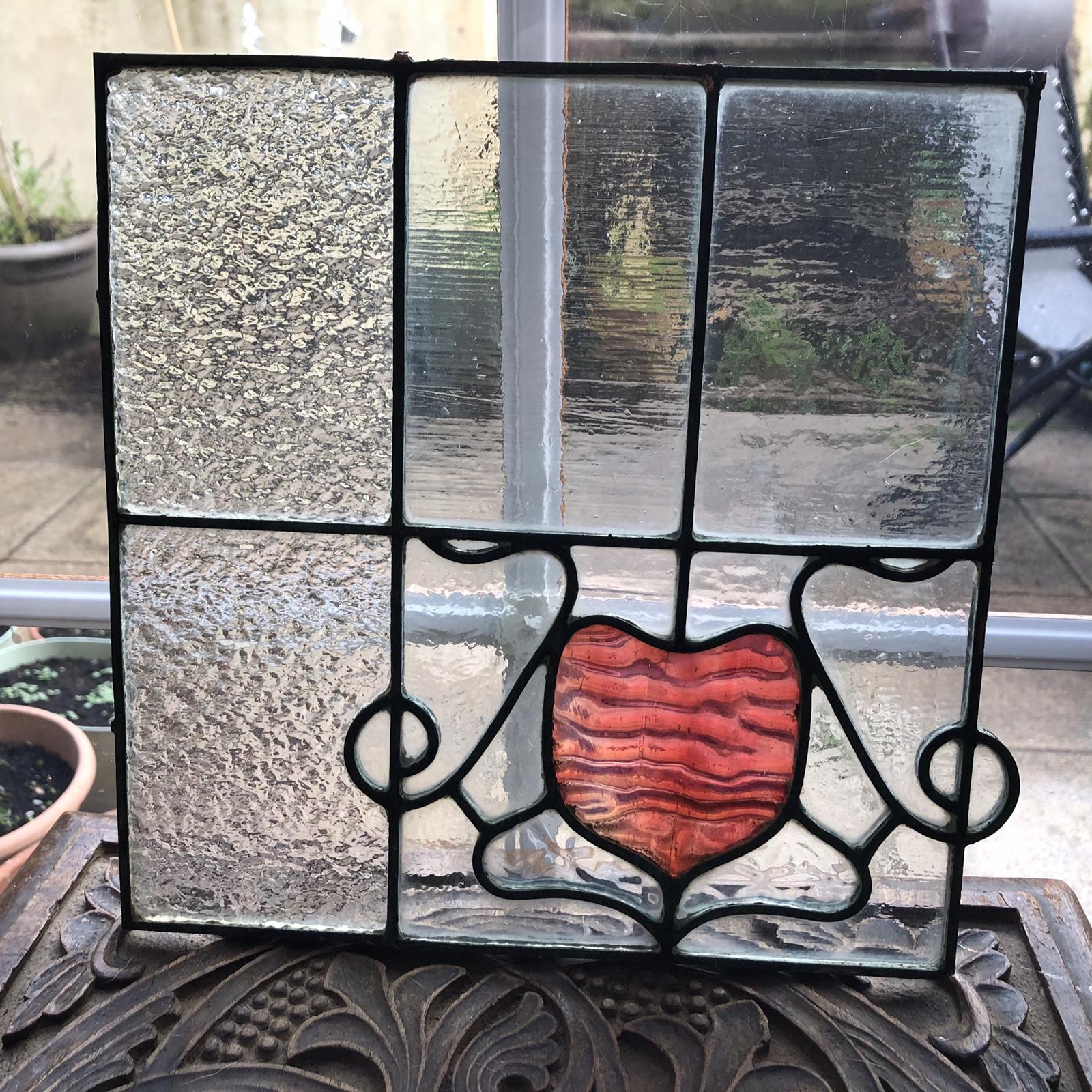 Antique Stained Glass Square Panel - Featuring a Pink Heart Detail