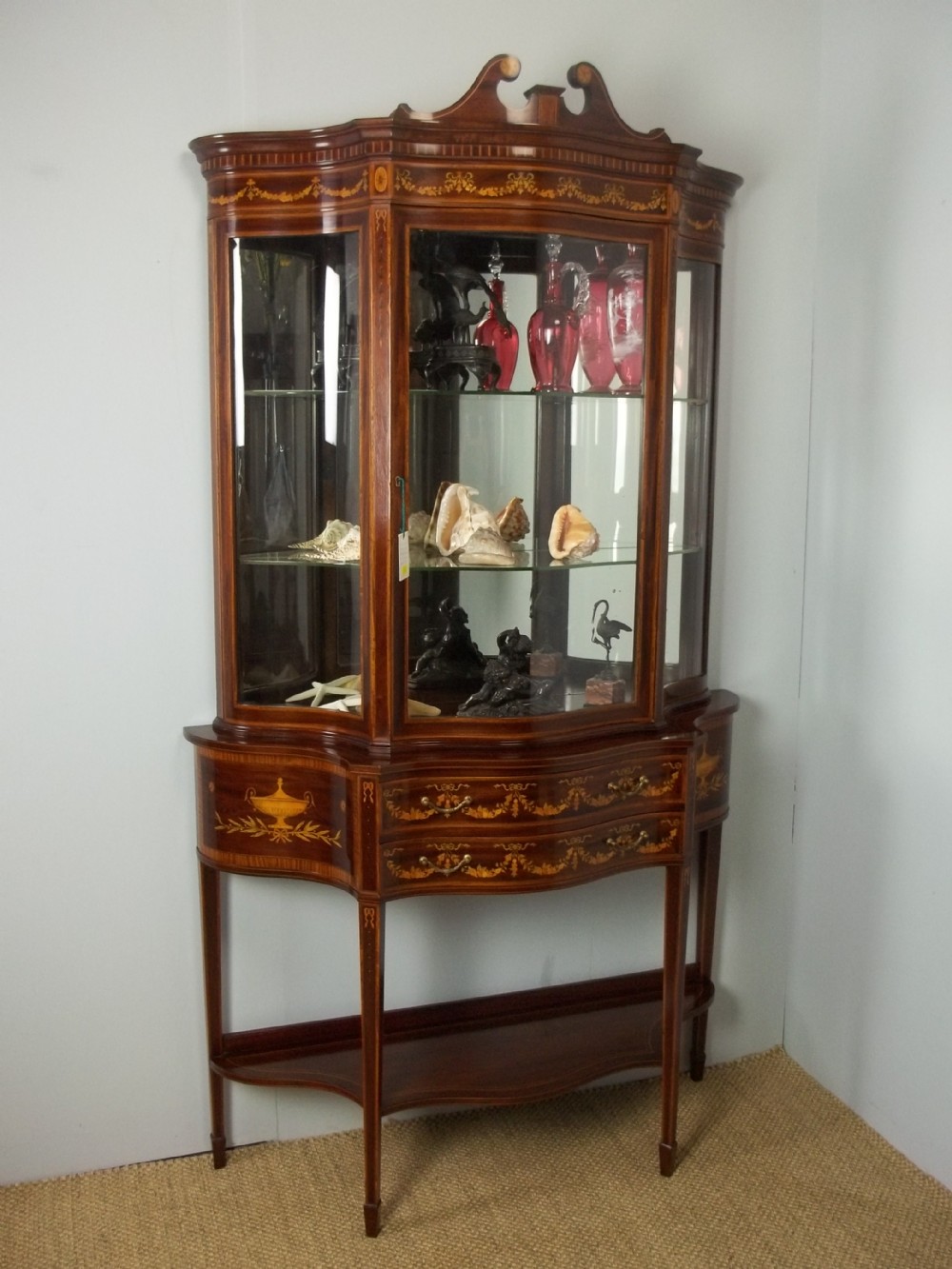 Antique Stamped Edwards & Roberts Mahogany Marquetry Inlaid Serpentine Fronted Collectors Display Cabinet Vitrine
