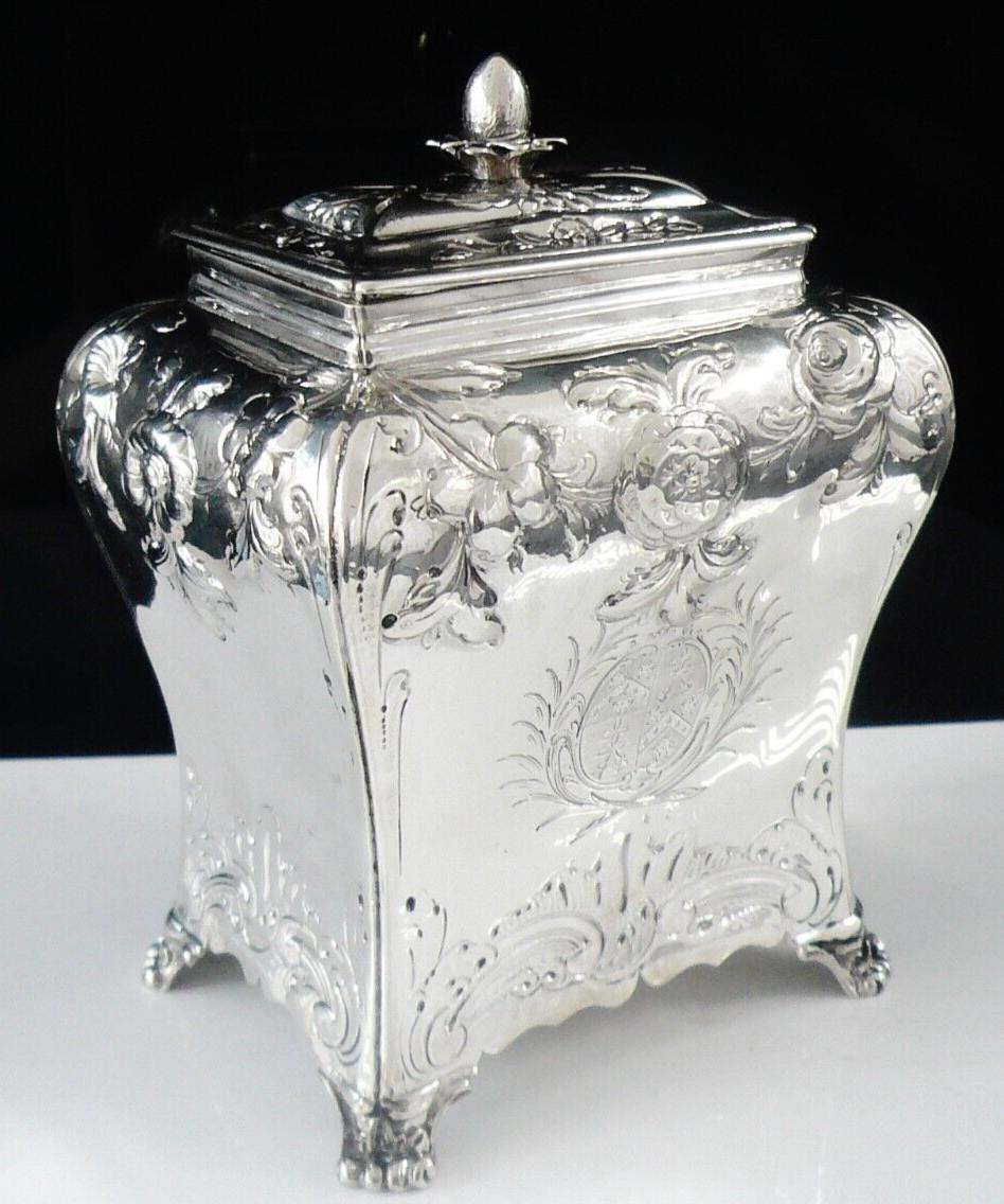 English antique sterling silver bombe shaped tea caddy with lift off lid, hallmarked from London in 1765 with the makers mark being that of Daniel Smith & Robert Sharp.