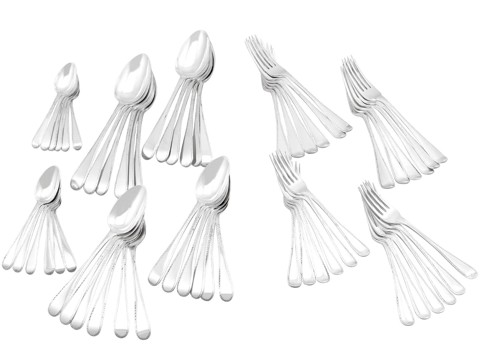 The pieces of this exceptional composite sterling silver flatware set for 12 persons have been crafted in the Old English feather edge pattern.