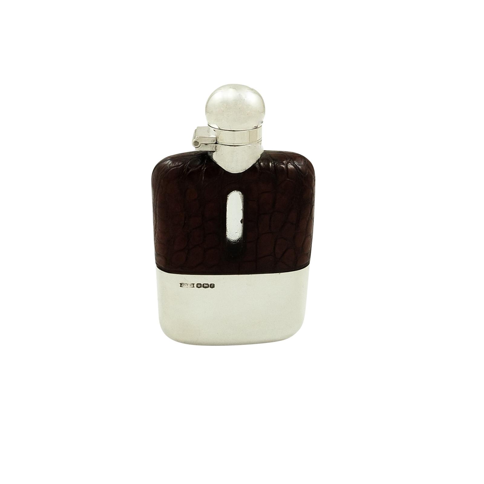 Antique Sterling Silver & Crocodile Leather Hip Flask 1924