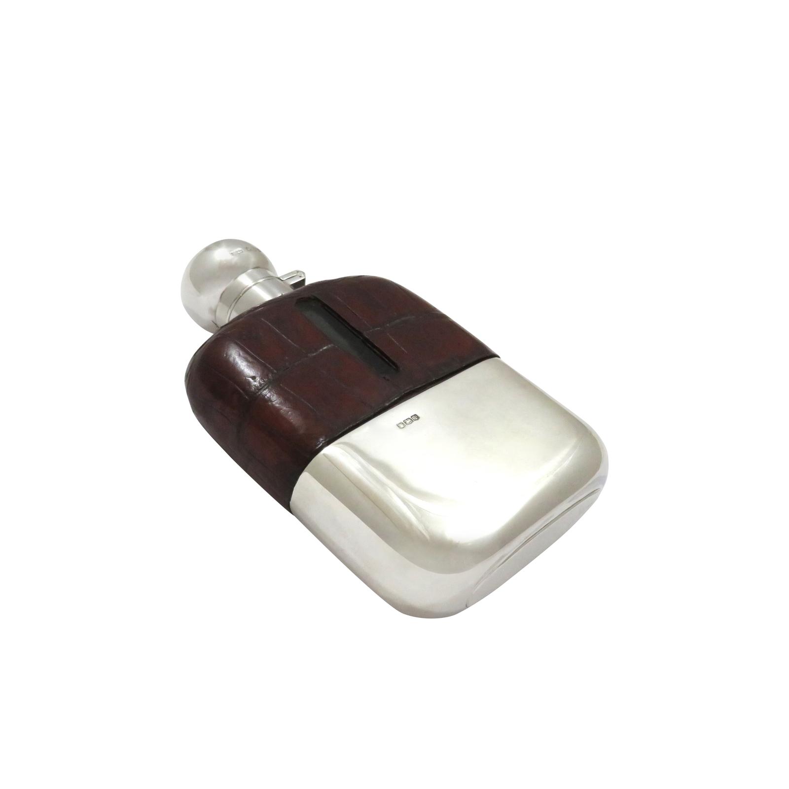 Antique Sterling Silver & Crocodile Leather Hip Flask 1928