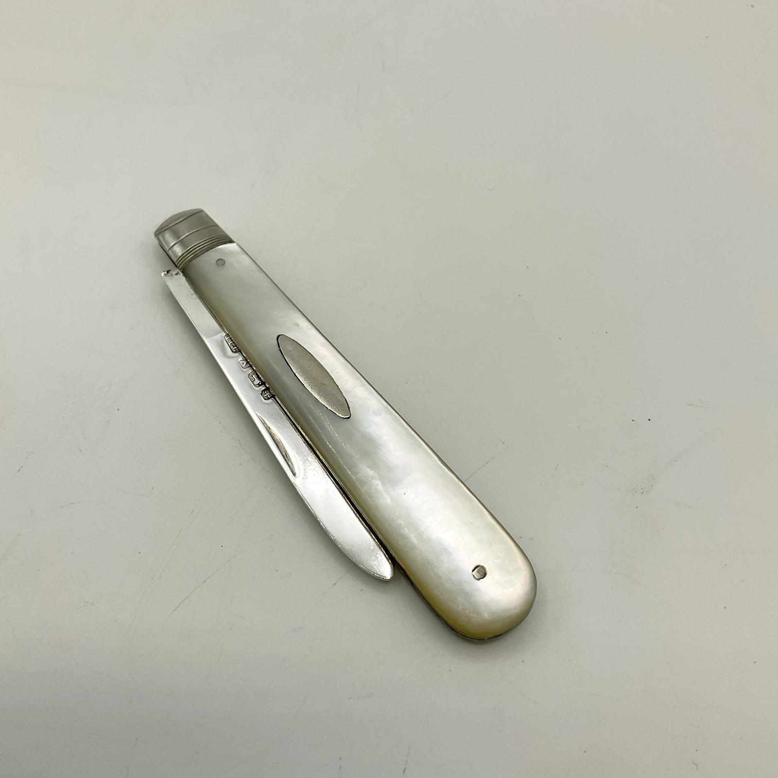 It has a Sterling Silver blade with the makers mark and hallmarks on. The beautiful handle is Mother of Pearl and features a blank oval cartouche on one side.