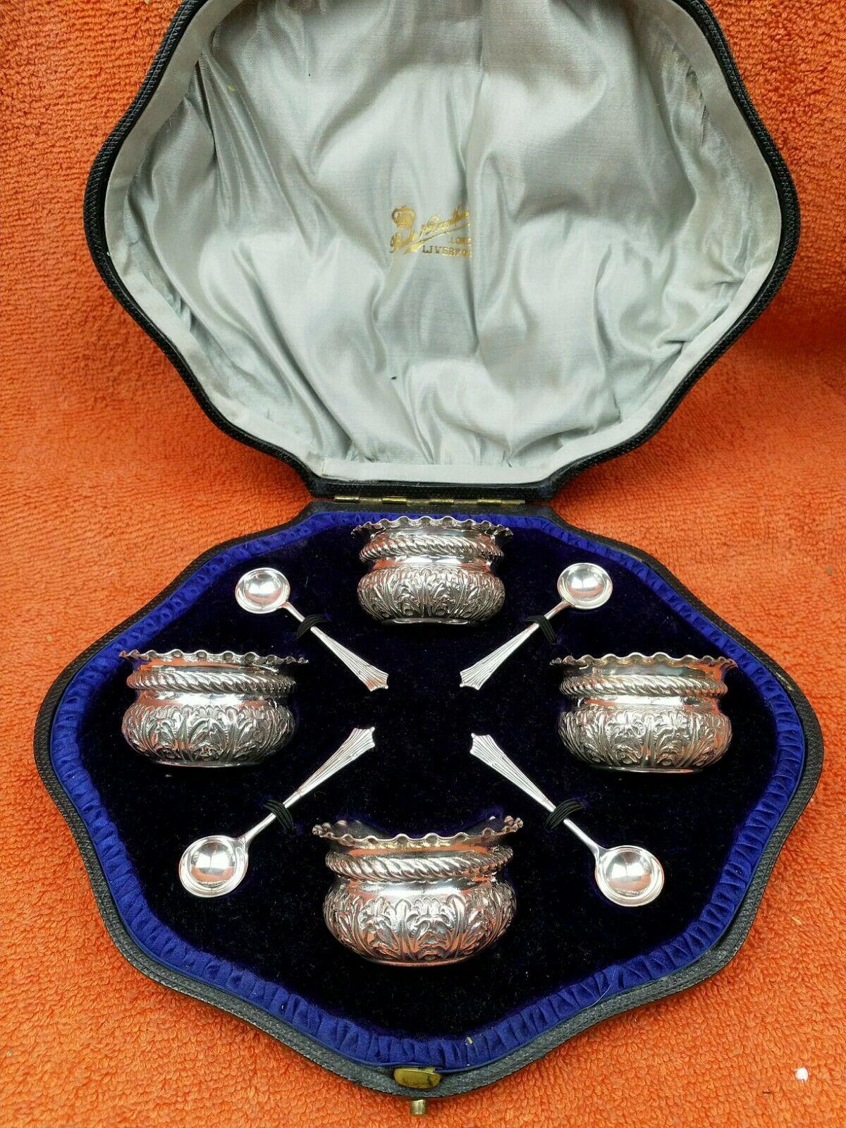 Antique Sterling Silver Hallmarked 1899 Cased Salts & Spoons