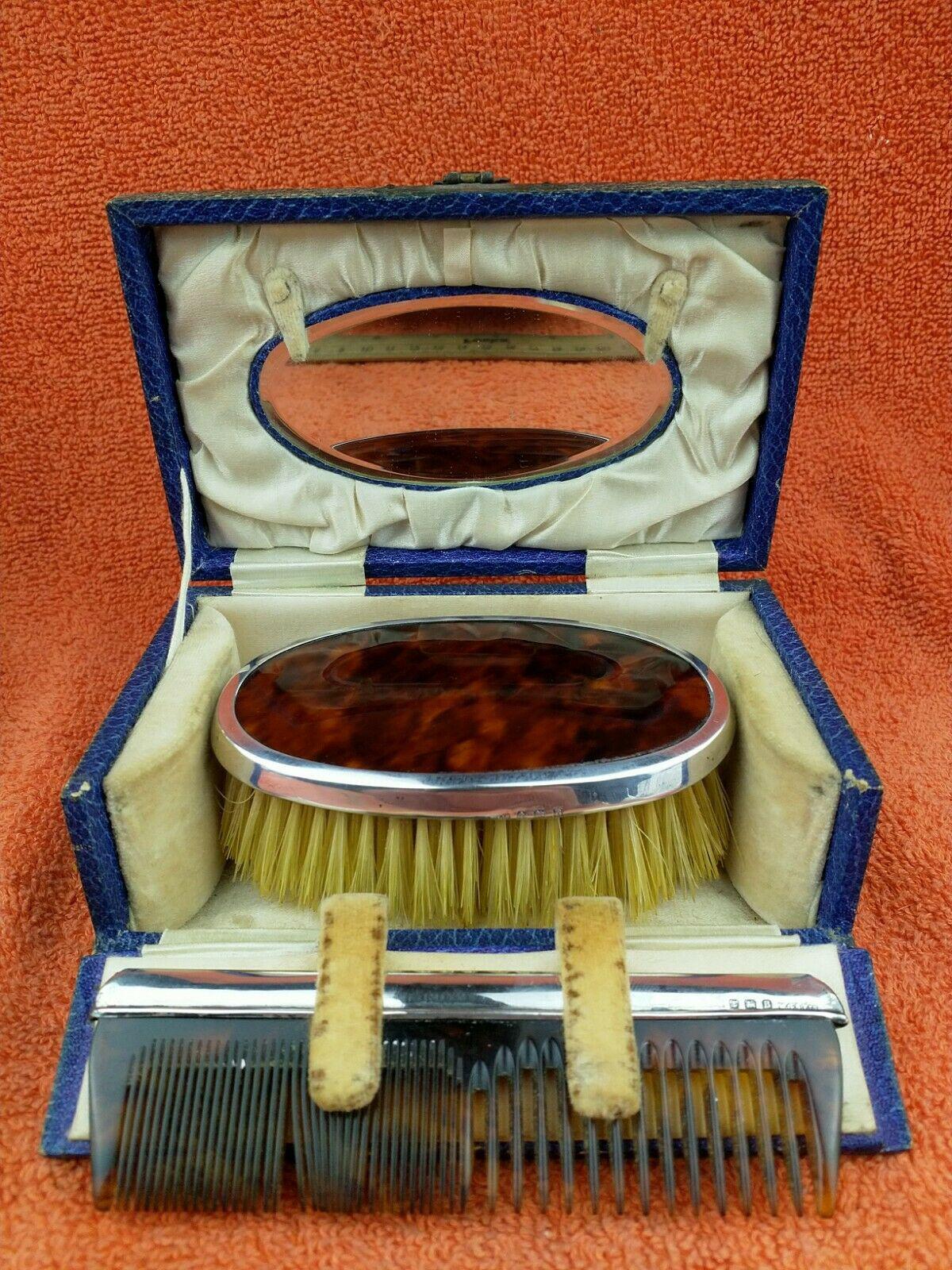 Antique Sterling Silver Hallmarked Cased Faux Tortoise Shell Brush & Comb Set with Mirror 1926