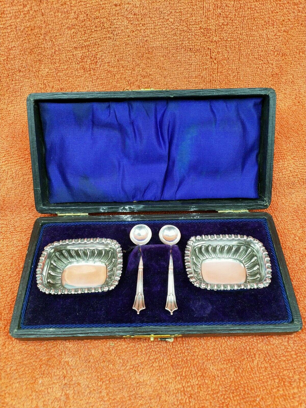 Antique Sterling Silver Hallmarked Cased Salts 1909 & 1923 Spoons J Collyer & Co Ltd