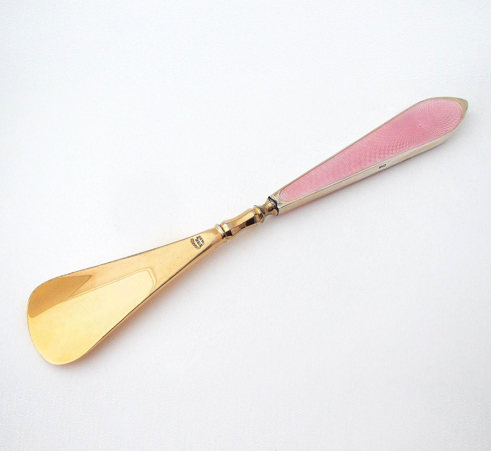 Antique Sterling Silver Handled Blush Pink Guilloche Enamel Gilded Shoehorn English Hallmarked Art Deco 1928