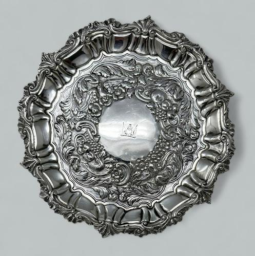 A Superb Example of an early heavy gauge Irish Sterling Silver Georgian style crested Card or Wine Tray of outstanding quality and exceptional condition for such an early silver item. The shaped circular form with exquisite stylish rim with highly ornate scrolling details, edged with scroll and shell decoration, inner surface chased with summer fruits, leafy foliage and birds. Raised on three firm supports, each with unusual double “C” scroll above a pointed pad foot. Mark of W N for William Nolan Dublin Hallmark for 1823. Condition: Superb condition with wonderful patination, no losses to anywhere. No repairs anywhere, good crisp easy to read hallmarks. Diameter: 8” (20cm). Weight: (an impressive) 15ozs. (426 grams). Location: Dublin City, Ireland. Affordable fixed charge Worldwide Store to door shipping offered by Seller. William Nolan Silversmiths: The renowned silversmith William Nolan, was active from 1811 to 1835, working on Whitefriar street, Dublin Ireland. Influenced by design trends from London, Nolan has often been said to be the Irish equivalent of Paul Storr, characterized by fine quality pieces in the Regency taste.