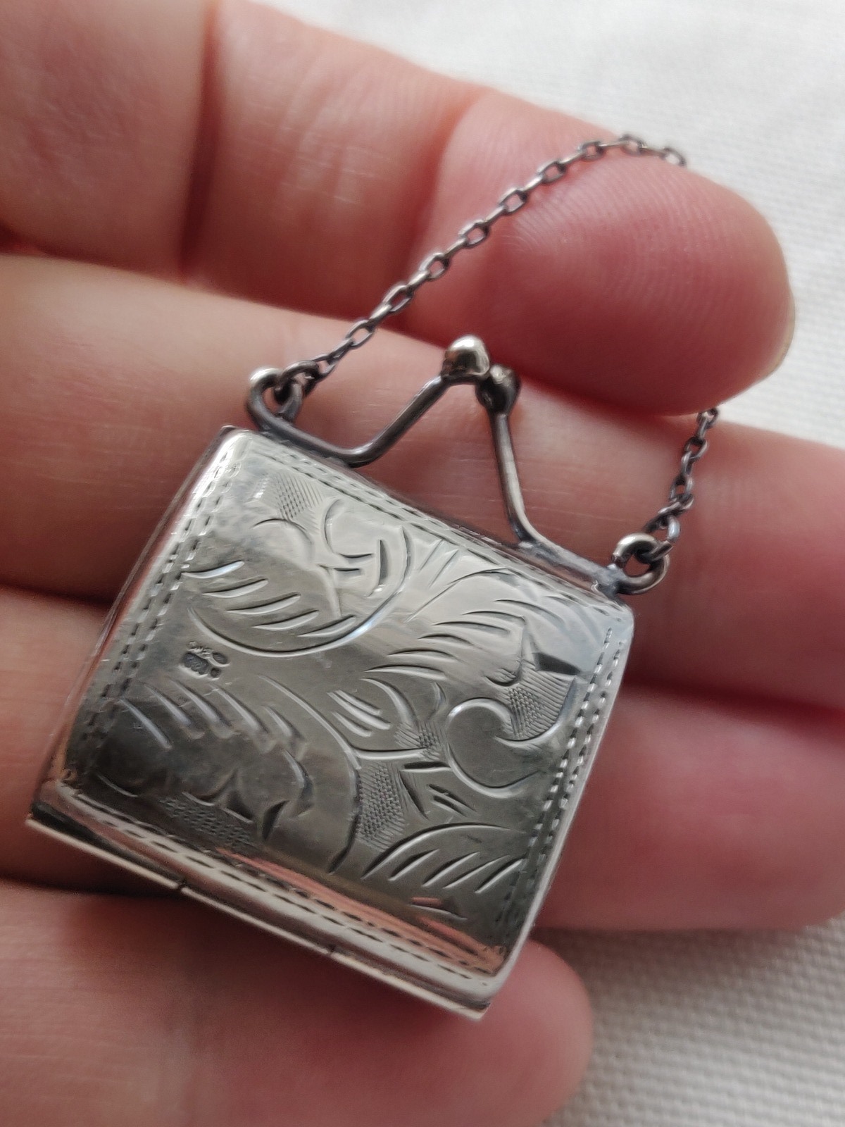 Antique Sterling Silver Mini Pill Box Purse on Chain Locket Bag c.1920
