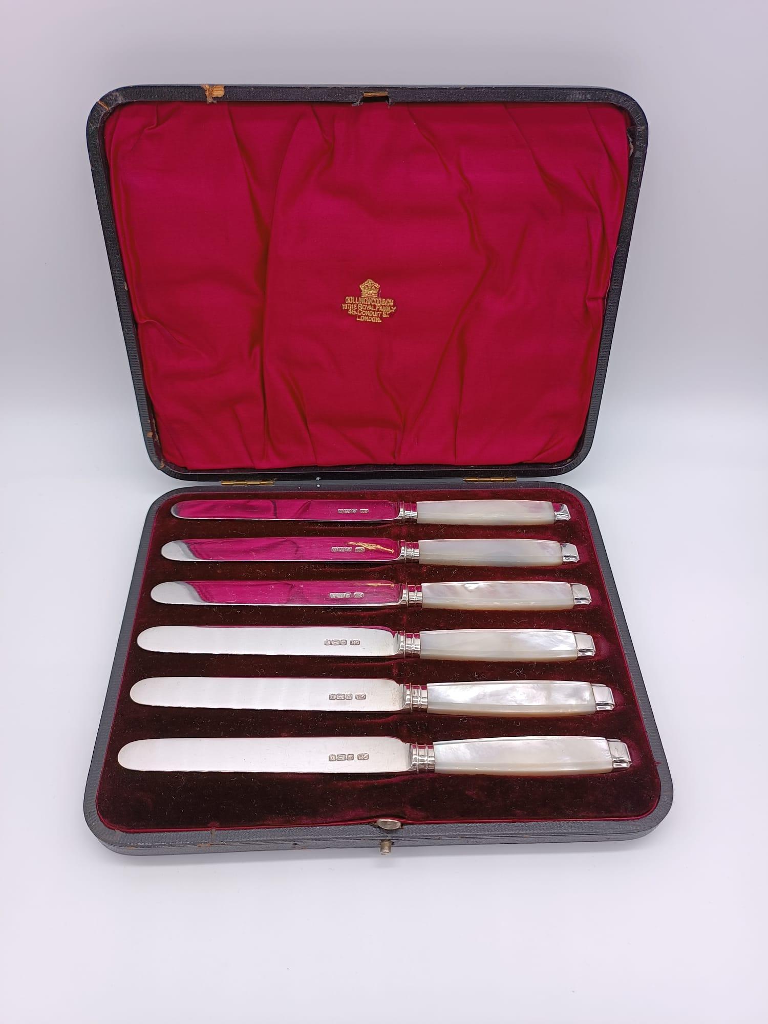 Antique Sterling Silver & Mother of Pearl Knife Set in Case Sheffield 1906