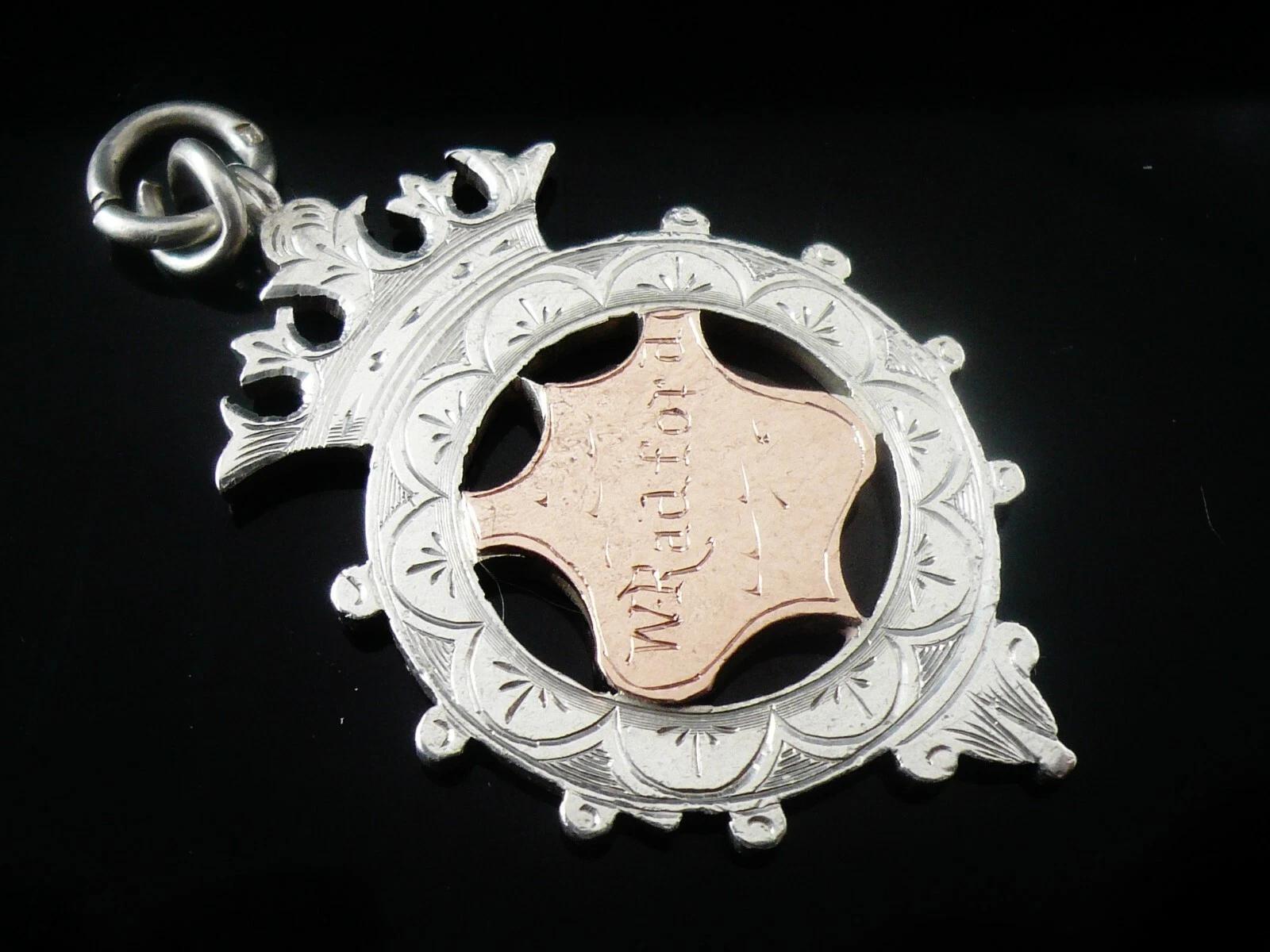 English antique sterling silver and gold pocket watch fob medal of excellent size by Vaughton & Sons, hallmarked from Birmingham in 1900.