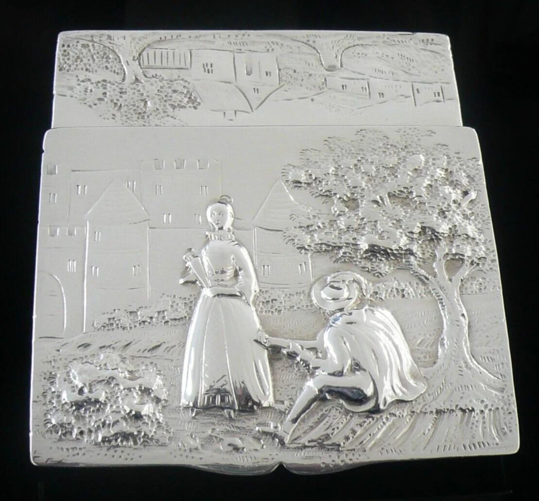 Decorated in high relief, the lid featuring a lady being serenaded by a young gentleman in front of a castle, other side also decorated and only the base is plain.