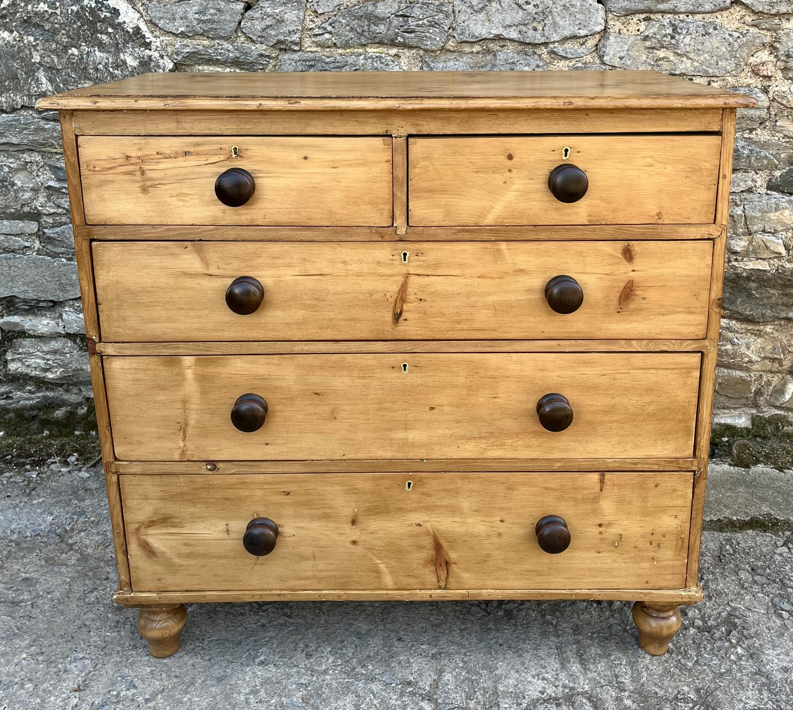 A lovely stripped pine chest of drawers dating from late 19th / early 20th Century. The pine has a nice warm colour and it is a good large size offering plenty of storage. Each drawer has turned wooden knobs and it stands on turned bun feet.