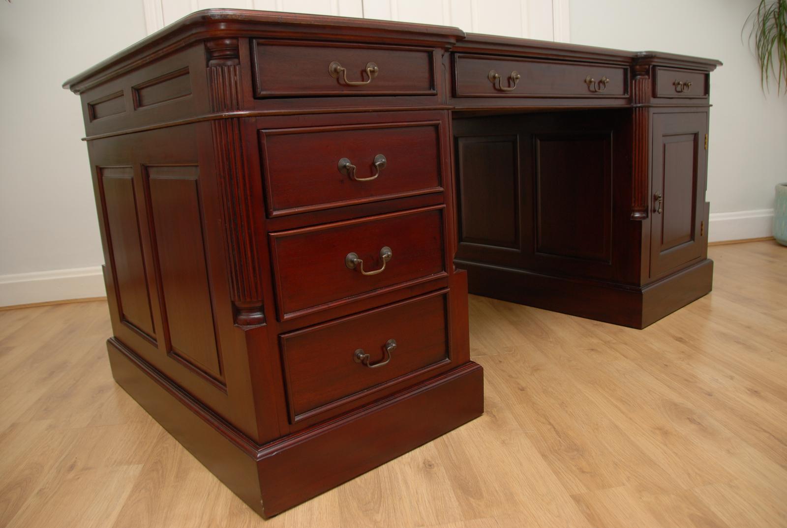 Antique Style Burr Walnut Twin Pedestal Partners Desk with Green Leather Top
