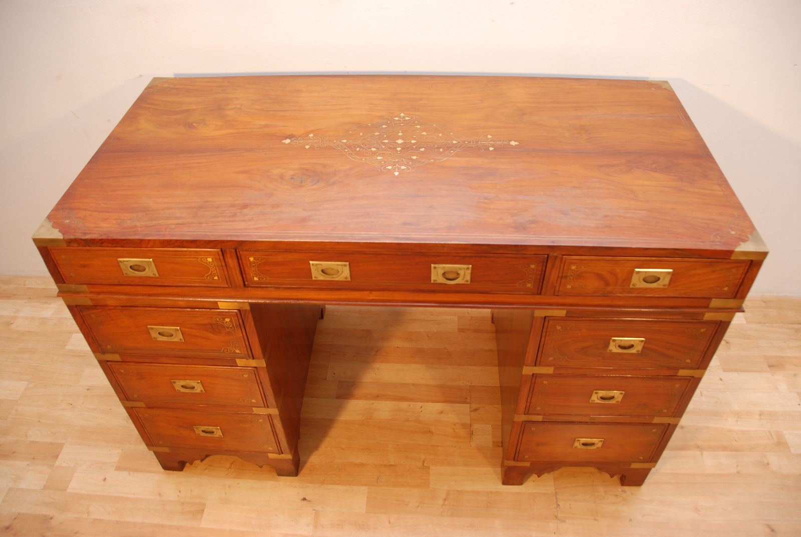 Antique Style Solid Mahogany Military Campaign Pedestal Writing Desk with Inlay