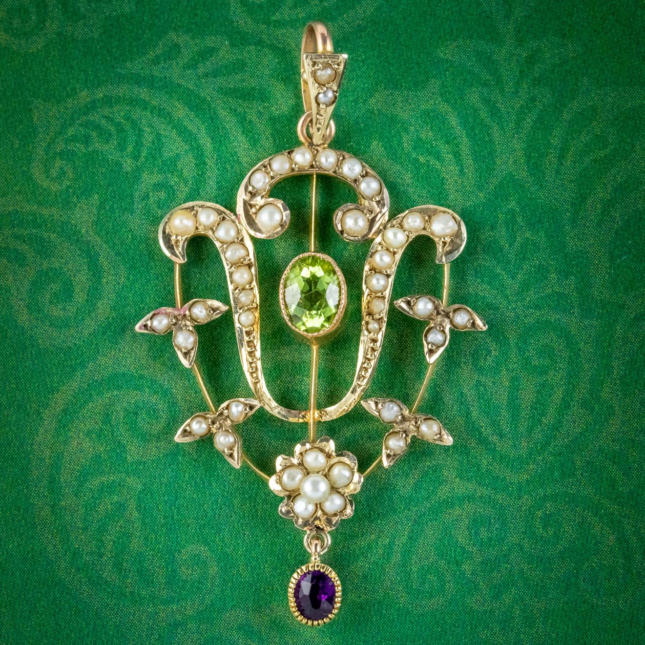 Antique Suffragette Art Nouveau Pendant Peridot Amethyst Pearl 9ct Gold c 1910