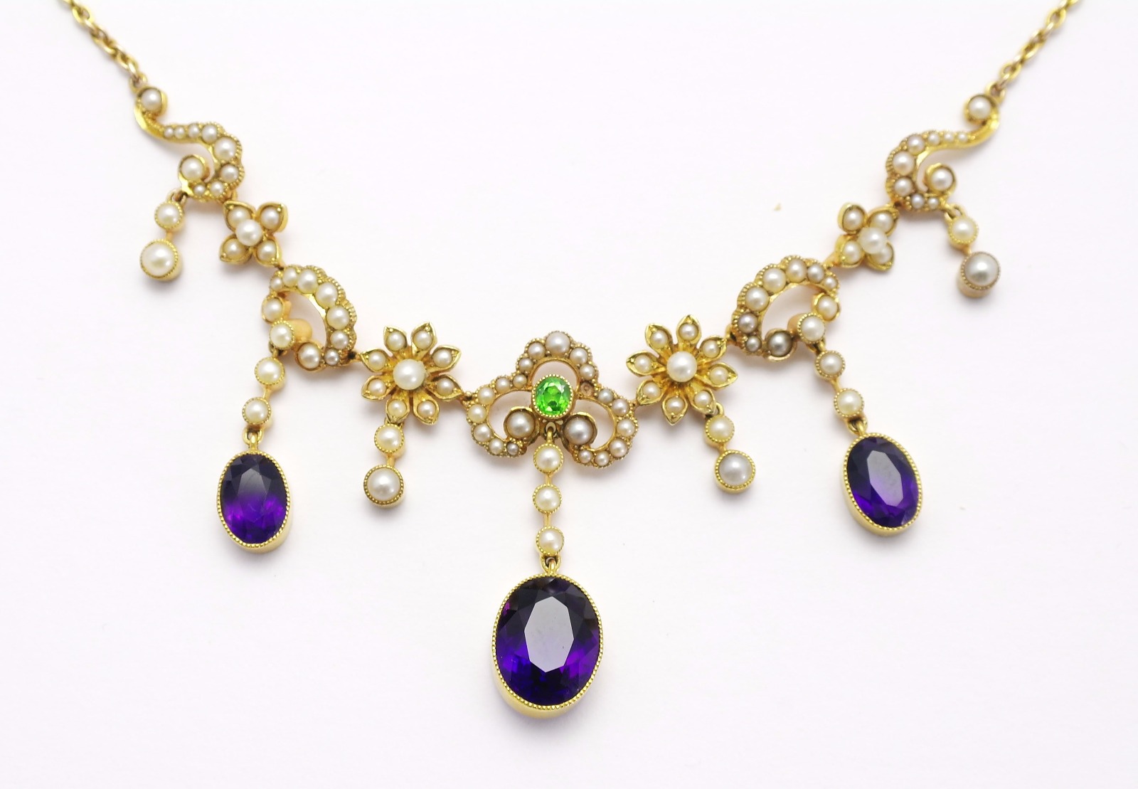 Antique Suffragette Gold Necklace with Amethyst Peridot & Pearls Edwardian Period Stunning!