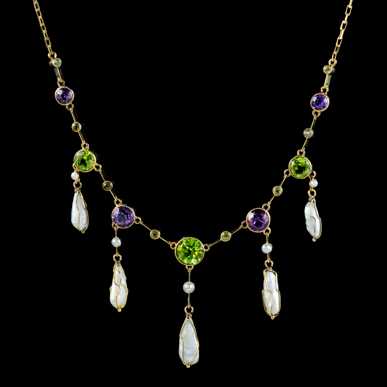 Antique Suffragette Necklace Baroque Pearls Amethyst Peridot 15ct Gold c.1910