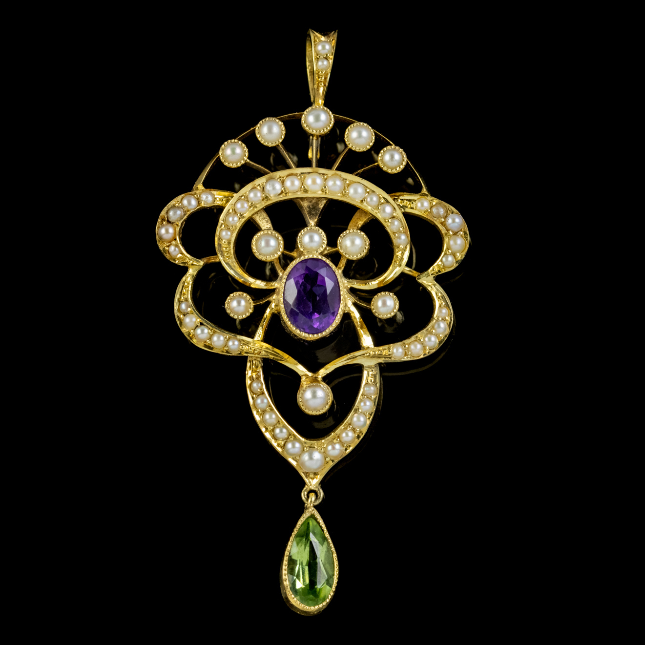 Antique Suffragette Pearl Pendant Amethyst Peridot 15ct Gold circa 1910