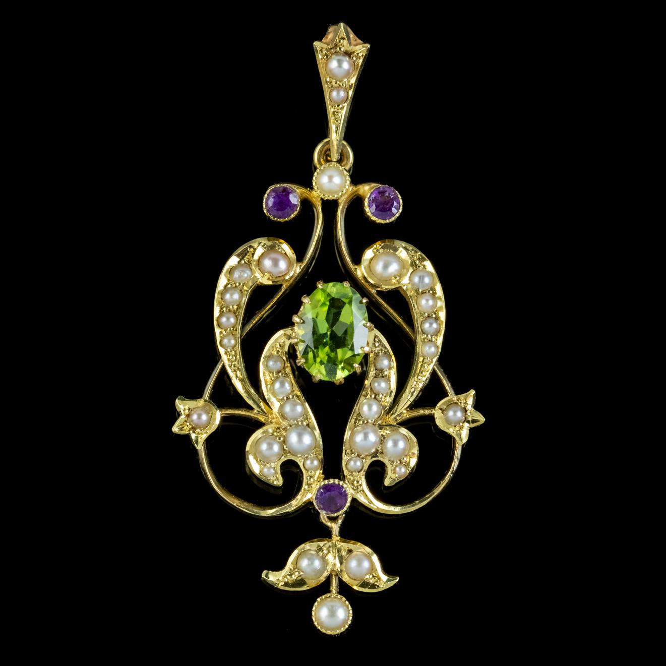 Antique Suffragette Pendant Peridot Amethyst Pearl 15ct Gold c.1910