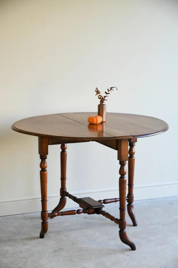 This is an antique Sutherland drop leaf table, crafted from fruitwood in the 19th century. The design features drop leaves, allowing for a compact form when not in use. This table is classified under lamp tables and originates from Britain. Its construction reflects the craftsmanship of the period.