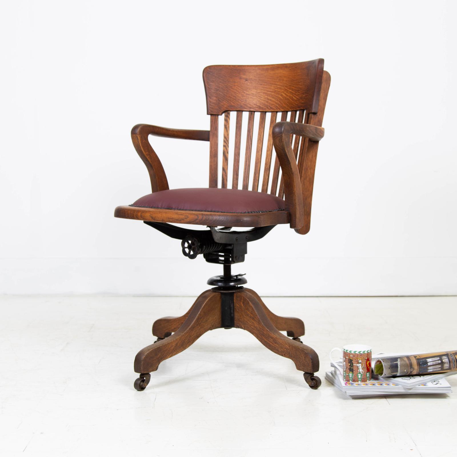 Antique Swivel Oak Office Desk Chair New Leather Seat C.1915
