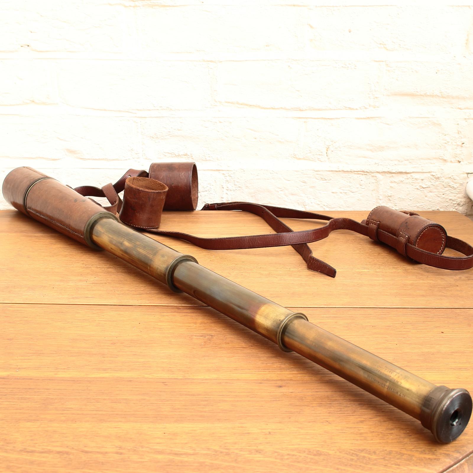 A fantastic three-draw telescope in brass with stitched leather barrel, leather end caps, shoulder strap and adjustment buckle, the eyepiece has sliding shutter, the front section has a sliding sun shade, comes with additional leather cased eyepiece, and is inscribed to first draw 'Reconditioned for John Barker & Co Ltd, Kensington W5 by Broadhurst Clarkson & Co''.