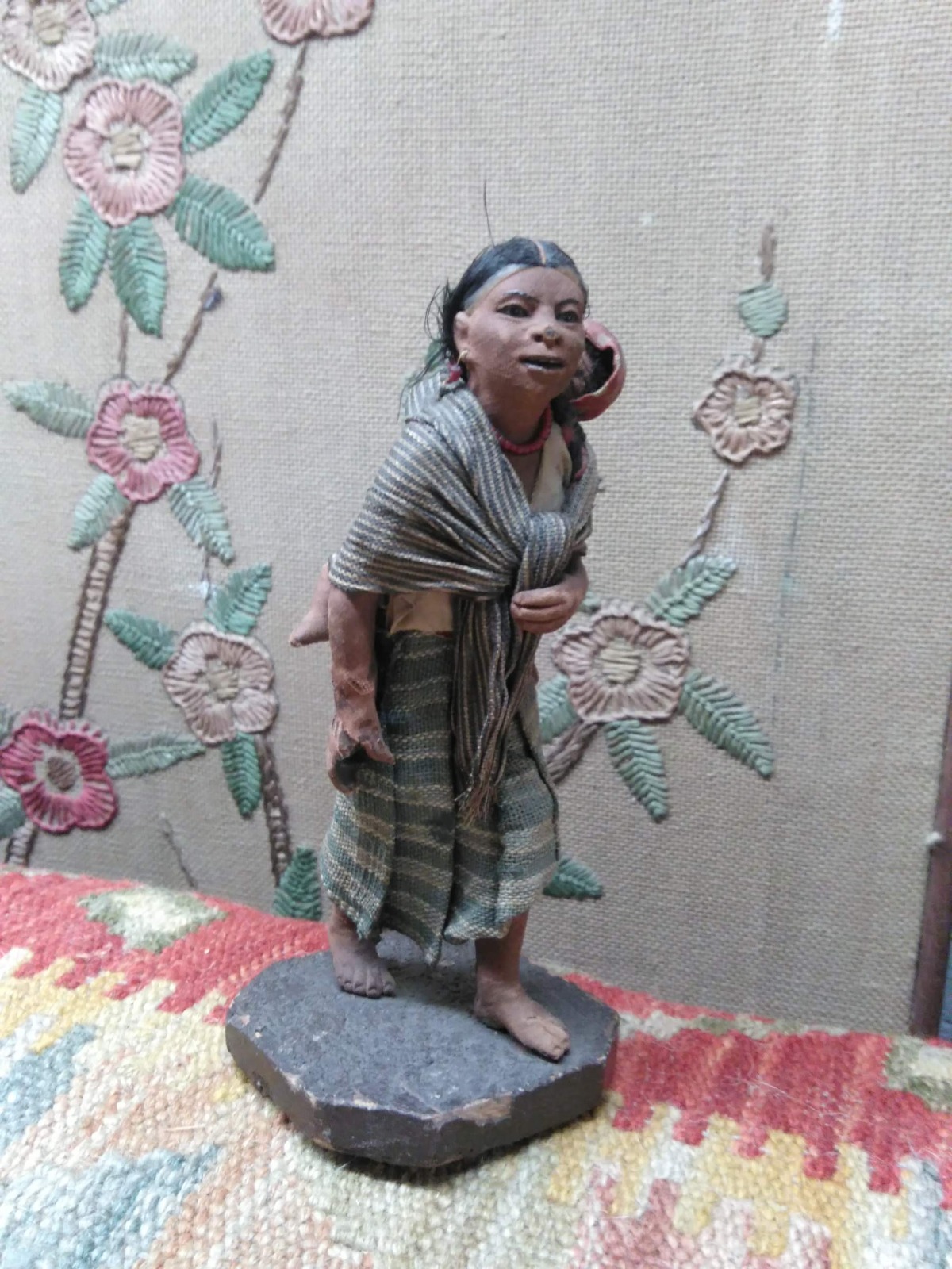 Antique Tibetan Wax Doll On Stand Mother Carrying Her Baby Ethnic Handmade