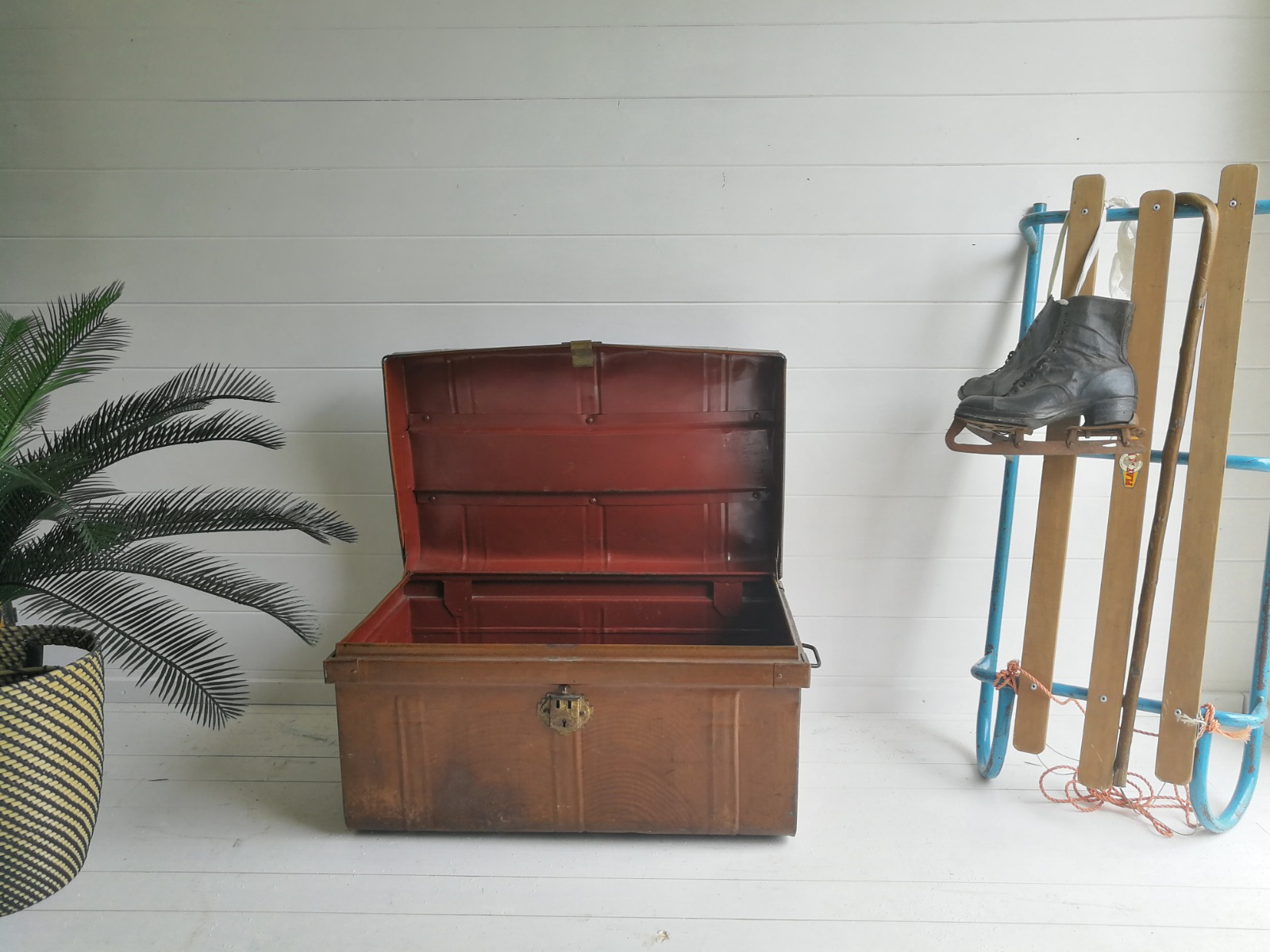 Antique Tin Trunk Large Steamer Coffee Table Case Travel Trunk 19th Century