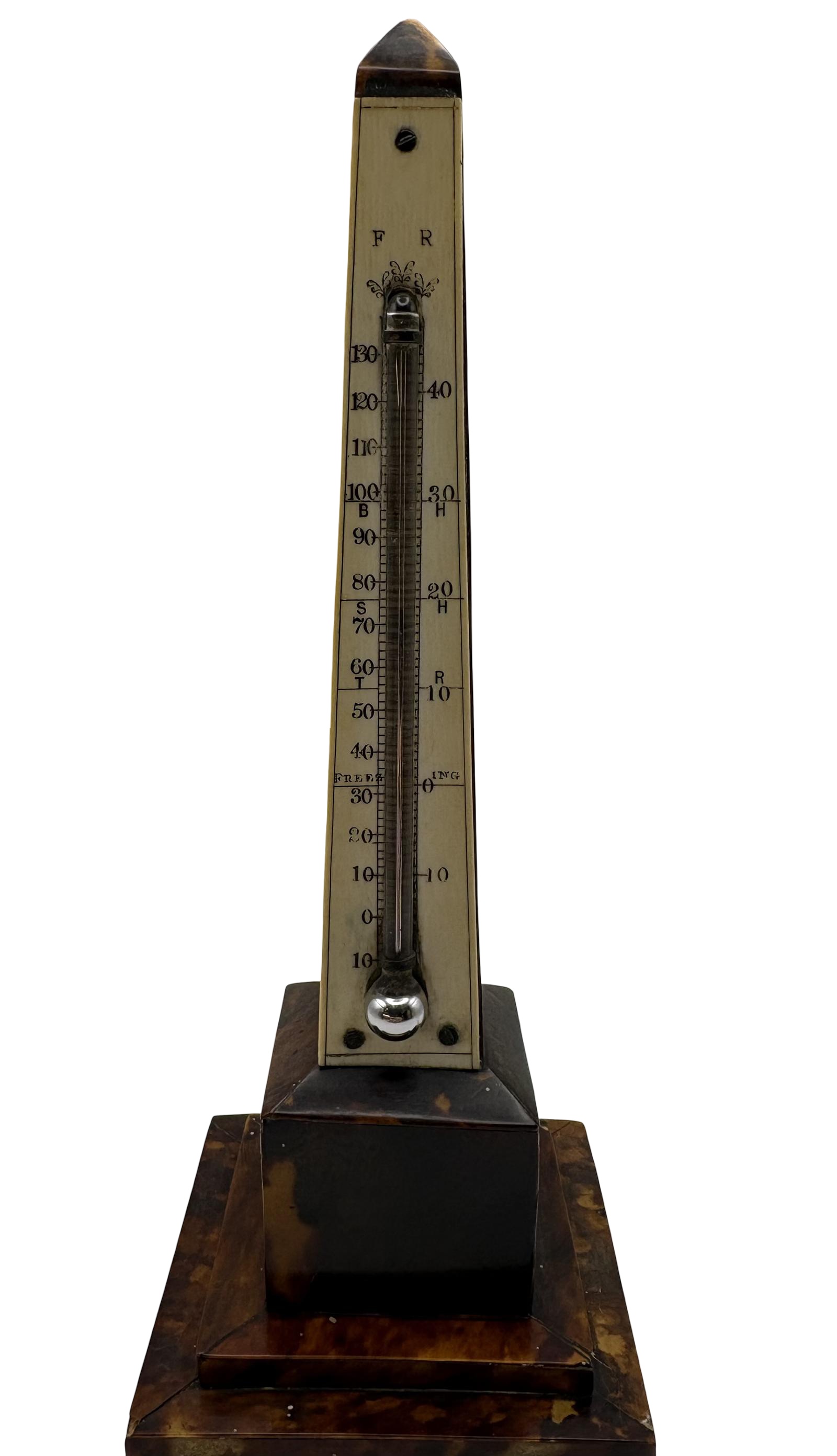A rare and elegant 19th-century obelisk-form thermometer, veneered in richly mottled tortoiseshell and fitted with a mercury thermometer and ivorine scale.